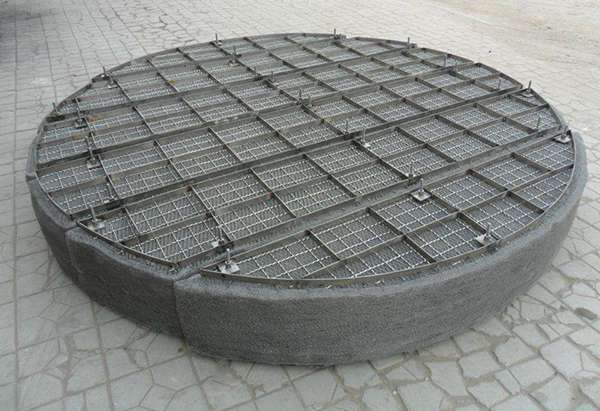 絲網(wǎng)除霧器又名絲網(wǎng)除沫器是由氣液過濾網(wǎng)墊(由若干塊網(wǎng)塊拼合而成)和支承件兩部分構(gòu)成。網(wǎng)塊是由若干層平鋪(圈繞)的波紋型氣液過濾網(wǎng)、格柵及定距桿等組合而成。用于分離氣體中夾帶的液滴直徑大于3~5μm的霧沫,回收昂貴的霧滴(貴重物料),或凈化氣體減少氣體中的雜質(zhì)。